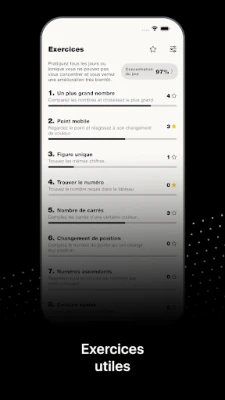 Plongez dans un environnement d'exercices stimulants, minutieusement élaborés pour stimuler diverses facultés cognitives. Affinez vos réflexes et votre réactivité à travers des défis dynamiques comme l'identification rapide de changements visuels ou la manipulation de séquences numériques. Sollicitez votre mémoire et votre pensée logique en vous engageant dans des tâches de mémorisation de positions et de chiffres, ou en associant des éléments visuels complexes. Des activités telles que les comparaisons de formes et la célèbre table de Schulte sont conçues pour cultiver une attention méticuleuse aux détails, tandis que des glissements directionnels entraînent votre agilité mentale. Chaque module est une étape vers une acuité mentale accrue.