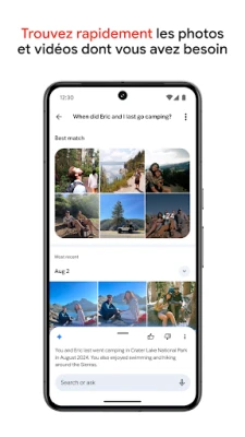 Transformez vos images avec les outils de retouche optimisés par l'IA. Corrigez sans effort les défauts : la Gomme magique supprime les éléments indésirables d'un geste, l'Anti-flou redonne de la netteté aux photos imprécises, et Éclairage portrait ajuste la luminosité pour des clichés impeccables. Retrouvez n'importe quelle image en un clin d'œil grâce à une recherche intuitive par description naturelle, que ce soit "Kayac sur un lac entouré de montagnes" ou "Emma qui peint dans le jardin". Google Photos prend également en charge l'organisation intelligente, en empilant automatiquement les doublons et en créant des dossiers futés pour vos captures d'écran, documents et albums personnalisés. Vous pouvez même sécuriser vos contenus les plus sensibles dans un dossier verrouillé, protégé par le verrouillage de l'écran de votre appareil.