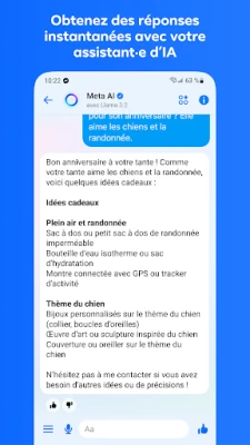 Au-delà des échanges personnels, Messenger est votre portail vers des communautés dynamiques et des contenus exclusifs. Rassemblez-vous avec des groupes partageant vos passions, qu'il s'agisse de votre association de quartier, de votre école ou de clubs dédiés à vos centres d'intérêt. Restez informé des dernières actualités de vos Creators préférés en rejoignant leurs canaux de diffusion, accédant ainsi à des contenus authentiques et privilégiés. Et pour une expérience enrichie, découvrez Meta AI, votre assistant intelligent intégré. Capable de répondre à vos questions, de vous fournir des conseils avisés, de vous aider dans vos tâches ou même de libérer votre créativité en générant et modifiant des images, Meta AI est là pour transformer vos interactions.