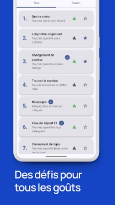 Plongez au cœur d'un entraînement cognitif dynamique avec Temps de Réaction : Test & Jeu, qui propose une panoplie de défis conçus pour stimuler chaque facette de votre agilité mentale. Mettez votre rapidité pure à l'épreuve avec des épreuves comme les 'Feux de départ F1', où chaque milliseconde compte pour un départ parfait. Aiguisez votre capacité de traitement visuel avec le 'Changement de couleur' et défiez votre concentration sélective grâce au 'Choix de couleur', qui requiert une attention infaillible. Explorez également des exercices ciblant la coordination œil-main, la détection visuelle rapide et la prise de décision sous pression, tels que la 'Balle mobile' et 'L'intrus', parmi une multitude d'autres tests stimulants.